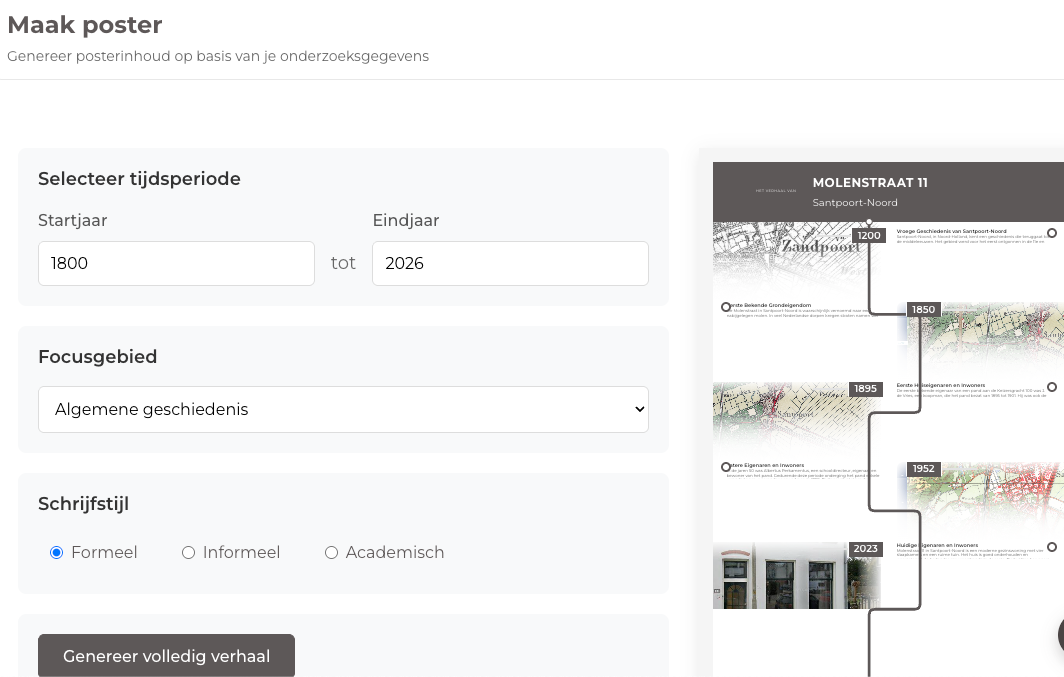 Tegelijk is er iets bijgekomen. Met de Homestory-app kunnen steeds meer mensen zélf aan de slag met de geschiedenis van hun huis. Die app bouwen we stap voor stap beter, slimmer en rijker. Recent hebben we daar een belangrijke stap in gezet: je kunt nu een poster-preview zien in de app.