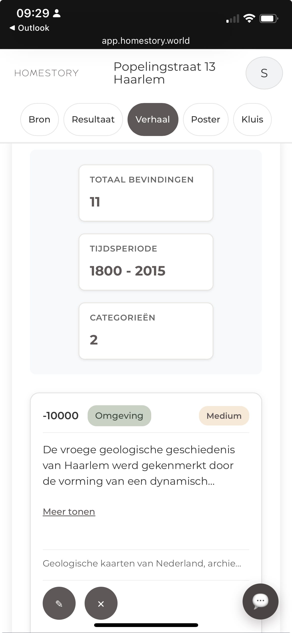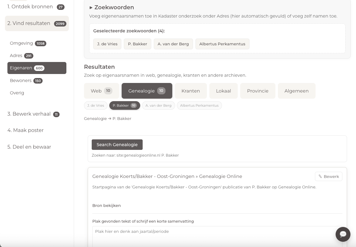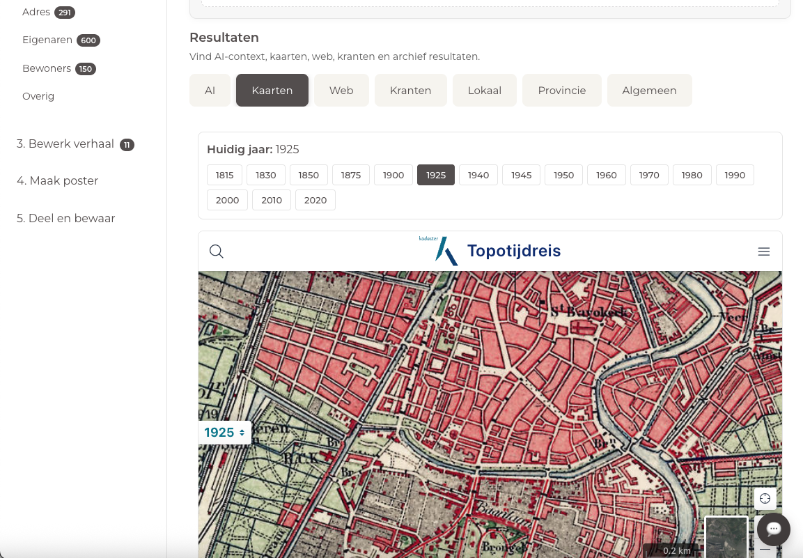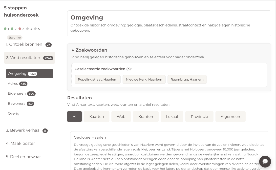 Op basis van je adres doen we automatisch zoekwoordsuggesties en laden we alvast eerste resultaten in, onder andere via AI, historische kaarten en streetview-beelden. Het echte onderzoek zit โm vervolgens in het selecteren van wat relevant is - en dรกt is precies waar de app je bij helpt.